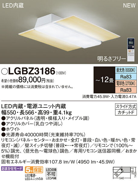 商 品 詳 細商品名インテリア 屋内 照明メーカー名パナソニック Panasonicメーカー器具名称シーリングライト(天井照明)仕様商品詳細光源◆LED(昼光色6500K・Ra83/電球色2700K・Ra83) ◆色温度:6500 K ◆光源寿命40000時間(光束維持率70%)寸法・質量◆幅:550 mm ◆長:566 mm ◆高:99 mm◆質量:4.1 kg仕様・注意事項LED照明の安心品質◆器具光束:4950 lm ◆電圧:100 V ◆消費電力:45.9 W ◆消費効率:107.8 lm/W◆畳数:〜12畳◆デザイン分類:Natural◆【アクリルパネル】透明・模様入り・メイプル調◆【アクリルカバー】乳白つや消し◆昼光色Ra83◆電球色Ra83◆リモコン(パネル・センター・おまかせ・全灯・普段・白い色・暖かい色・常夜灯・滅)◆壁スイッチ切替(普段←→常夜灯)◆リモコンで〈100%〜5%〉調光、〈昼光色〜電球色〉調色◆専用リモコン送信器同梱◆おまかせ機能付◆入力電流(100V時):0.47 A注意事項◆写真方向以外取り付け不可 ※施工・電気工事は専門業者にご依頼ください。