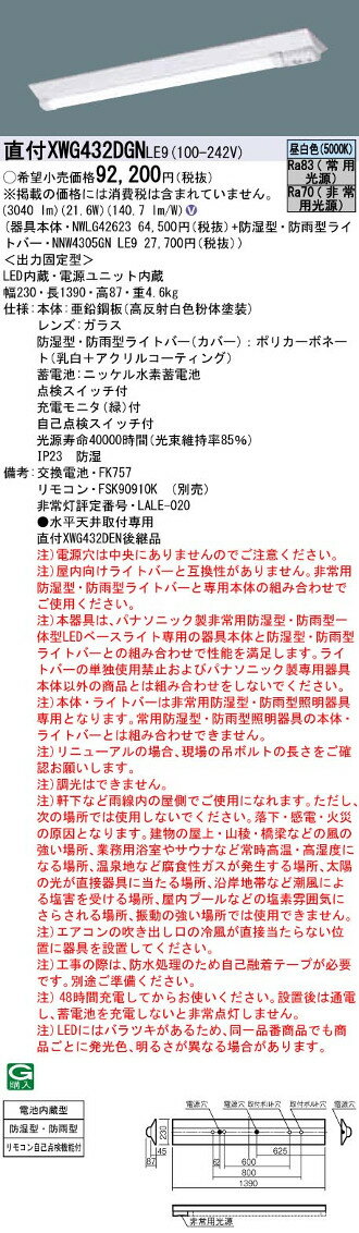 【商品詳細】 ◆器具本体:NWLG42623 ◆ライトバー:NNW4305GN LE9 ◆非常時本体組込LED点灯 常時ライトバー点灯 ◆ランプ色温度:5000K ◆光源寿命40000時間(光束維持率85%) ◆寸法 幅:230mm 長:1390mm 高:87mm ◆質量:4.6kg ◆全光束:3040 lm ◆安定器出力型:定格出力型 ◆安定器補足:<出力固定型> ◆電圧:100〜242 V ◆消費電力:21.6 W ◆消費効率:140.7 lm/W ◆本体:亜鉛鋼板(高反射白色粉体塗装) ◆レンズ:ガラス ◆蓄電池:ニッケル水素蓄電池 ◆点検スイッチ付 ◆充電モニタ(緑)付 ◆自己点検スイッチ付 ◆IP23 防湿 ◆Ra83(常用光源) ◆Ra70(非常用光源) ◆非常灯評定番号:LALE-020 ◆交換電池:FK757 ◆リモコン:FSK90910K(別売) ◆水平天井取付専用 【注意事項】 ◆注)電源穴は中央にありませんのでご注意ください。