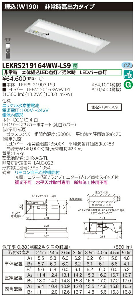 カテゴリ:照明器具 施設照明 非常用照明器具 TENQOO メーカー:東芝 型番:lekrs219164ww-ls9 / lekrs219164wwls9 ◎照明関連 【おすすめ Fケーブル】 (※適合に関しては事前にご確認ください) VVF1.6x2C VVF2.0x2C VVF1.6x3C VVF2.0x3C