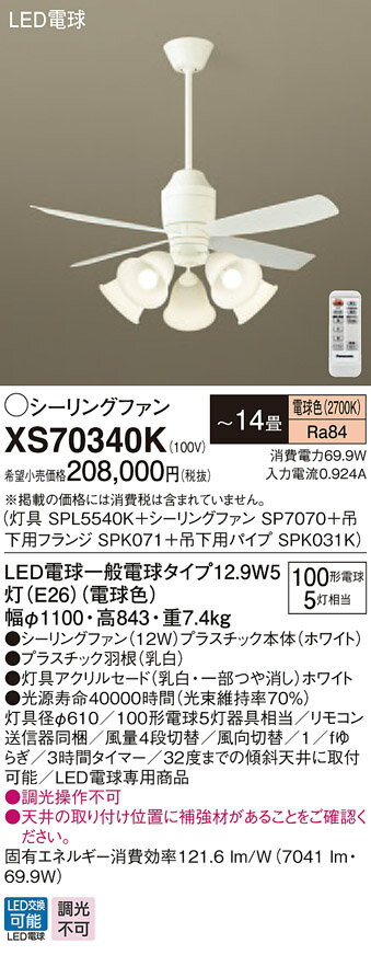 商 品 詳 細商品名インテリア 屋内 照明メーカー名パナソニック Panasonicメーカー器具名称シーリングファン(天井扇)仕様光源◆LED電球一般電球タイプ12.9W5灯(E26)(電球色)◆色温度:2700 K◆光源寿命40000時間(光束維持率70%)寸法・質量◆幅:φ1100 mm◆高:843 mm◆質量:7.4 kg仕様・注意事項LED照明の安心品質◆器具光束:7041 lm◆電圧:100 V◆消費電力:69.9 W◆消費効率:121.6 lm/W◆畳数:〜14畳◆Ra84◆灯具径φ610◆100形電球5灯器具相当◆リモコン送信器同梱◆風量4段切替◆風向切替◆1/fゆらぎ◆3時間タイマー◆32度までの傾斜天井に取付可能◆LED電球専用商品◆入力電流(100V時):0.924 A◆調光操作不可◆天井の取り付け位置に補強材があることをご確認ください。