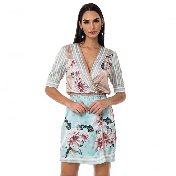ワンピース スカーフ柄 花柄 カシュクール インポート 【ブラジル製】 【即納】 5部袖 スカート 春夏 ピンク Vネック 海外ファッション 直輸入 膝上 おしゃれ 大人可愛い 他と被らない 送料無料